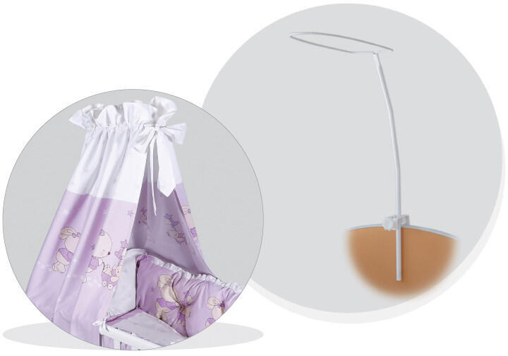 Két ponton, stabilan rögzíthető baldachinvas. A kiságyhoz fúrás nélkül, könnyen rögzíthető. A baldachin öltözteti a babaszobát, csökkenti a beszűrődő fényeket, így járul hozzá a baba nyugalmához. Méretek:4×17×167 cm